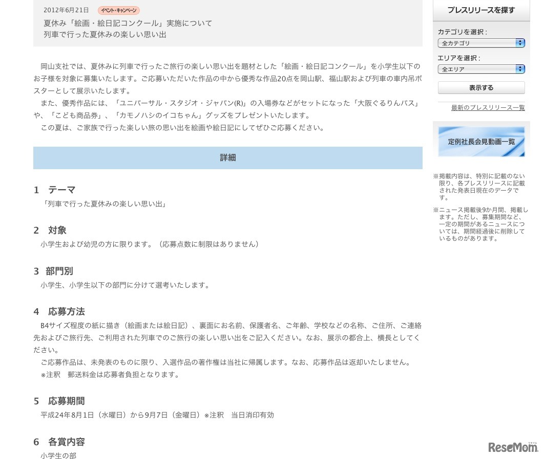 JR西日本(西日本旅客鉄道)は6月21日、小学生以下の子どもを対象とした夏休み「絵画・絵日記コンクール」の実施について発表した。作品は、B5サイズ程度の紙を使用して横長に絵画または絵日記を描き、裏面に必要事項を記入の上、郵送する