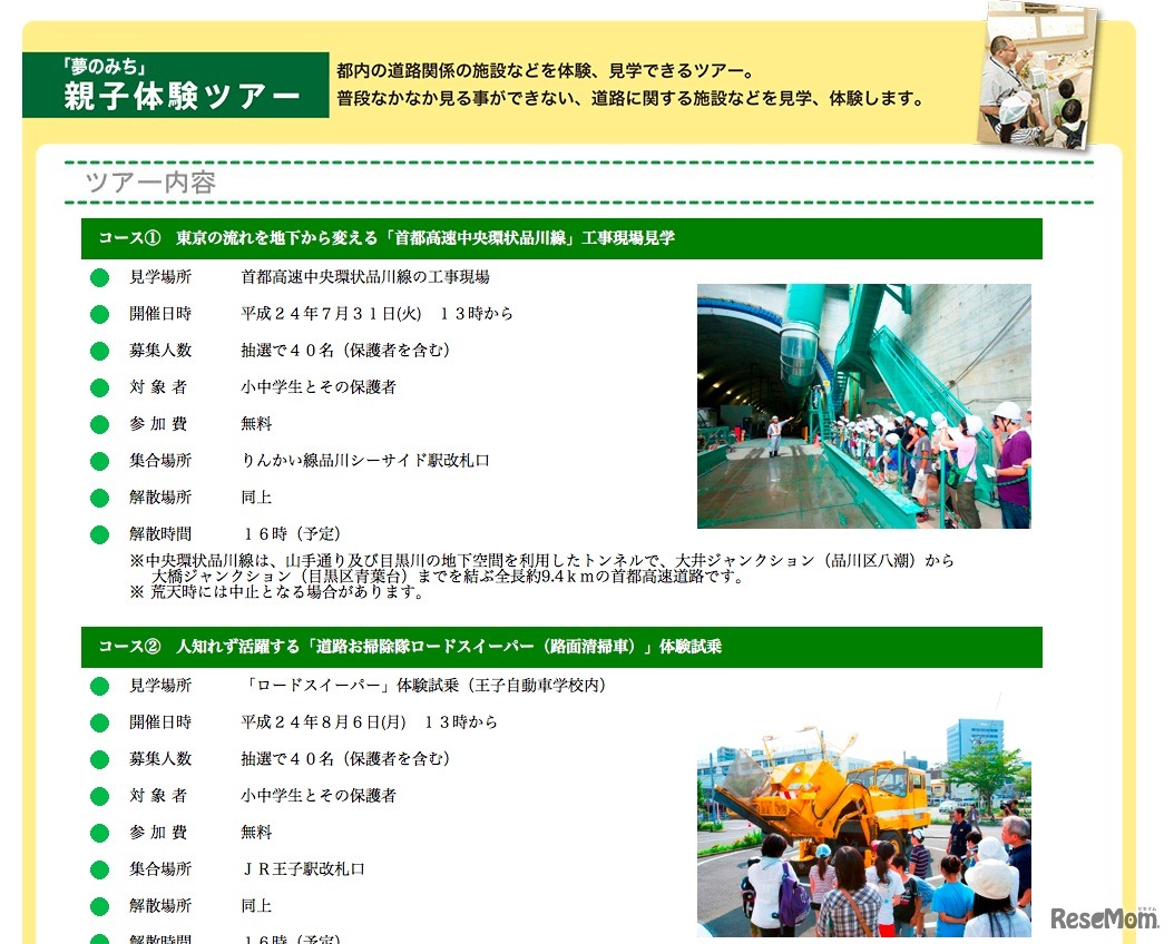 東京都道路整備保全公社と東京都建設局では、都民の“道”に対する理解を深めることを目的とした「夢のみち」事業の一環として、工事現場や施設を見学する親子体験ツアーなどの各種イベントを夏休み期間中に開催する。