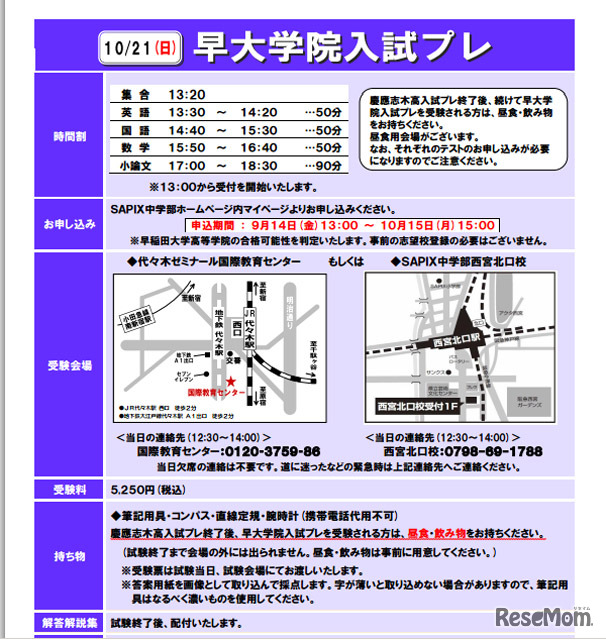 SAPIX中学部では、10月21日、慶應志木高、早大学院、都立日比谷、西高を目指す中3生を対象に、公開模試・学校別入試プレを実施する。申込期間は9月14日〜10月15日。受験料は各5,250円。会場は、代々木ゼミナールもしくは、SAPIX中学部 西宮北口校。