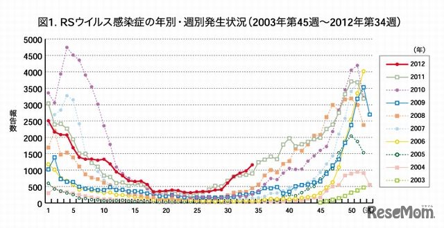 乳幼児の肺炎の原因ともなる「RSウイルス感染症」が7月以降連続して増加が続いており、8月27日から9月2日までの1週間で1,998例にのぼることが国立感染症研究所の調査で明らかになった。今後も拡大の恐れがあり注意を呼びかけている。