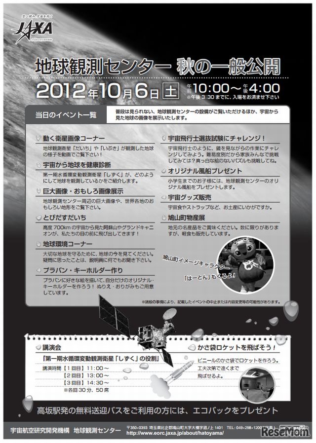 JAXA「地球観測センター施設」では、10月6日(土)に施設一般公開を行う。「講演会」や「宇宙飛行士選抜試験にチャレンジ」などが催される。入場無料。なお、「手作りロケット製作・打ち上げ」イベントへの参加は、事前申込みが必要だ。
