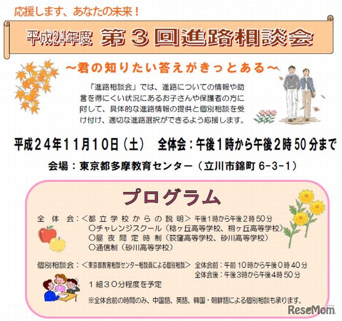 東京都教育相談センターでは、中途退学や不登校などで進路についての情報を得にくい子どもや保護者に対して、都立高校就学に関する情報提供と個別相談を行う進路相談会を実施している。10月1日から第3回・第4回の個別相談会の申込みを受け付ける。