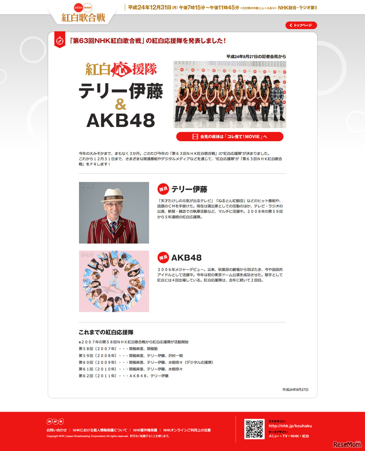 NHKは、大晦日に開催する「第63回 NHK紅白歌合戦」(2012年12月31日18時45分〜23時45分)の観覧者募集を開始した。申込みは、郵便往復はがきで受け付け、応募者多数の場合は抽選となる。
