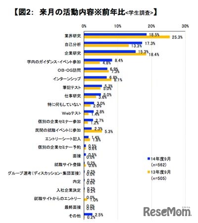エン・ジャパンは10月5日、「2014年度新卒採用 就職・採用活動アンケート」の結果を発表した。学生の現在の活動内容は「インターンシップ」「就職サイト登録」が上位だったが、「特に何もしていない」が前年の調査より増えていることが分かった。