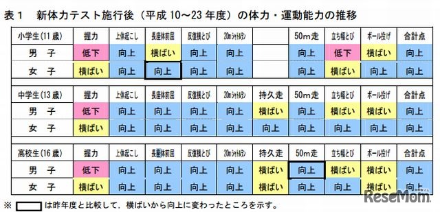 文部科学省は10月8日、2011年度に実施した体力・運動能力調査結果を発表した。小中高校生のすべての年代において男子の握力が低下しているほか、小学生男子の立ち幅とびが低下していることが明らかになった。