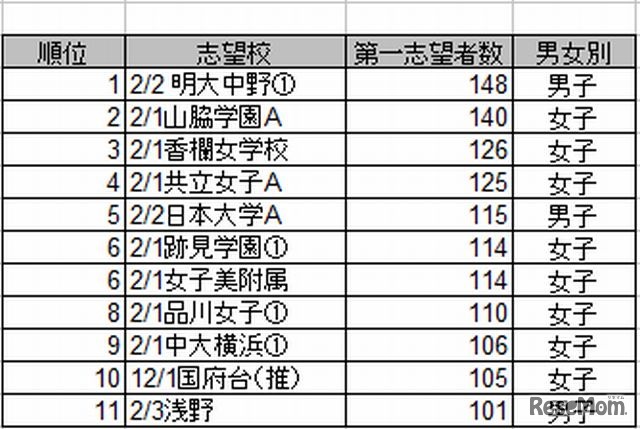 中学受験の第一志望者数がもっとも多い学校は、男子が「明大中野」、女子が「山脇学園」であることが、首都圏模試センターが公表した第4回「小6統一合判」の度数分布表より判明した。