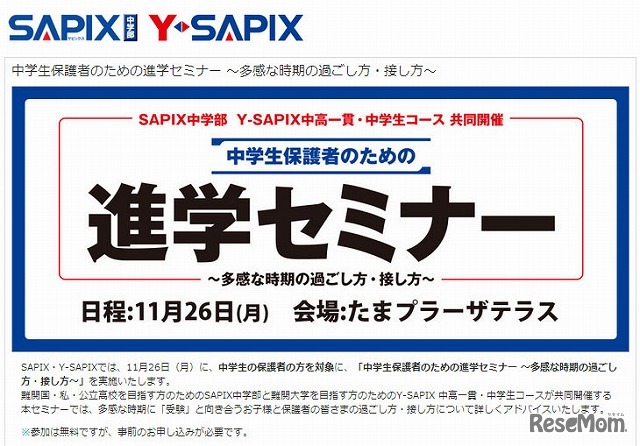SAPIX、Y-SAPIXは11月26日に、中学生の保護者を対象に「中学生保護者のための進学セミナー 多感な時期の過ごし方・接し方」を開催する。参加は無料だが、事前の申し込みが必要。