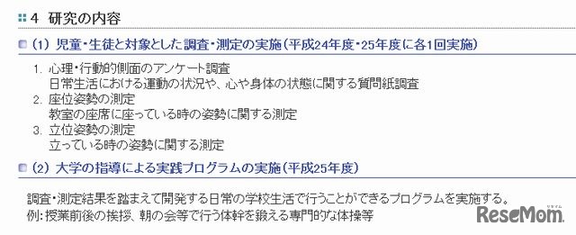 東京都教育委員会では、全国で初めて「子供の体幹を鍛える―正しい姿勢のもたらす教育的効果の検証―」の研究を早稲田大学と連携し、2012・13年度の2か年計画で実施する。研究にあたっては研究協力校を指定し、2012年11月から2013年3月まで調査・測定を行う。