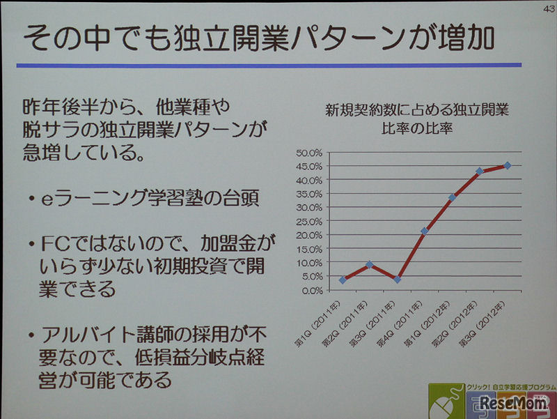 塾のスタイル、生徒の学習スタイル、講師の役割の変化からか、独立開業型の塾が増えている