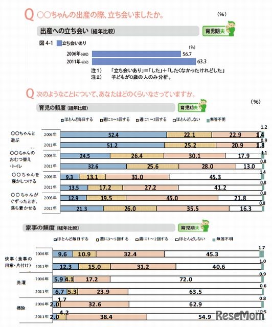 ベネッセ次世代育成研究所は11月16日、ひとりっこを持つ夫婦を対象とした「妊娠出産子育て基本調査」の結果を公表した。前回調査した2006年と比較して、夫の育児・家事参加時間が増加、保育への信頼や生活満足度も上昇したことがわかった。