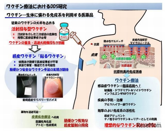 コスメディ製薬と大阪大学は、貼るワクチンを考案した。インフルエンザに対する経皮ワクチンの臨床研究を実施し、ヒトへの安全性や有効性を検証した。実用化は早くて5~6年後という。