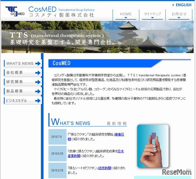 コスメディ製薬と大阪大学は、貼るワクチンを考案した。インフルエンザに対する経皮ワクチンの臨床研究を実施し、ヒトへの安全性や有効性を検証した。実用化は早くて5~6年後という。