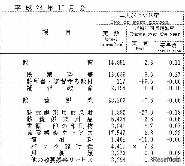 総務省は11月30日、2人以上の世帯の家計調査報告について、2012年10月分の速報結果を公表した。教育費は、14,951円と3か月ぶりの実質増加で、前年同月比実質2.2%の増加となった。