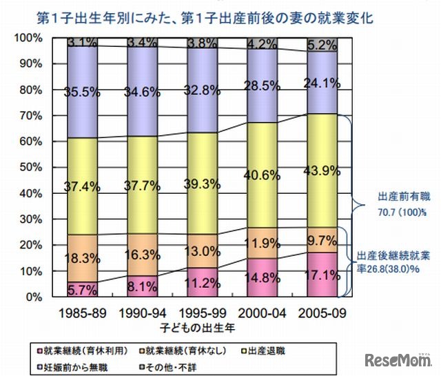 厚生労働省は12月4日、仕事と家庭の両立支援対策に関する資料をホームページに公開した。女性の出産後継続就業率は26.8%、出産退職は43.9%である現状から、2015年に50%、2020年に55%まで引き上げる目標を掲げる。