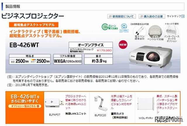 エプソンは、プロジェクターで投写した壁やボードなどの画面上に電子ペンで書き込みができる「電子黒板機能」を備えた「EB-436WT」と「EB-426WT」の2機種を2013年1月24日より発売する。