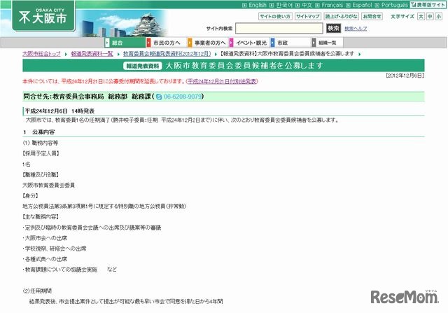 橋下徹大阪市長は12月31日、自身のTwitterで大阪市教育委員募集をアピールした。今回の募集は、「女性で中学3年生までの子どもを持つ者」という条件が付いている。募集期間は1月22日まで。