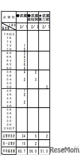 首都圏模試センターは、1月13日に実施した第5回「小5目標校シミュレーション」の受験生がどの学校へどのくらいの人数が志望校として選んだかを表にした「度数分布表」をホームページで公表した。