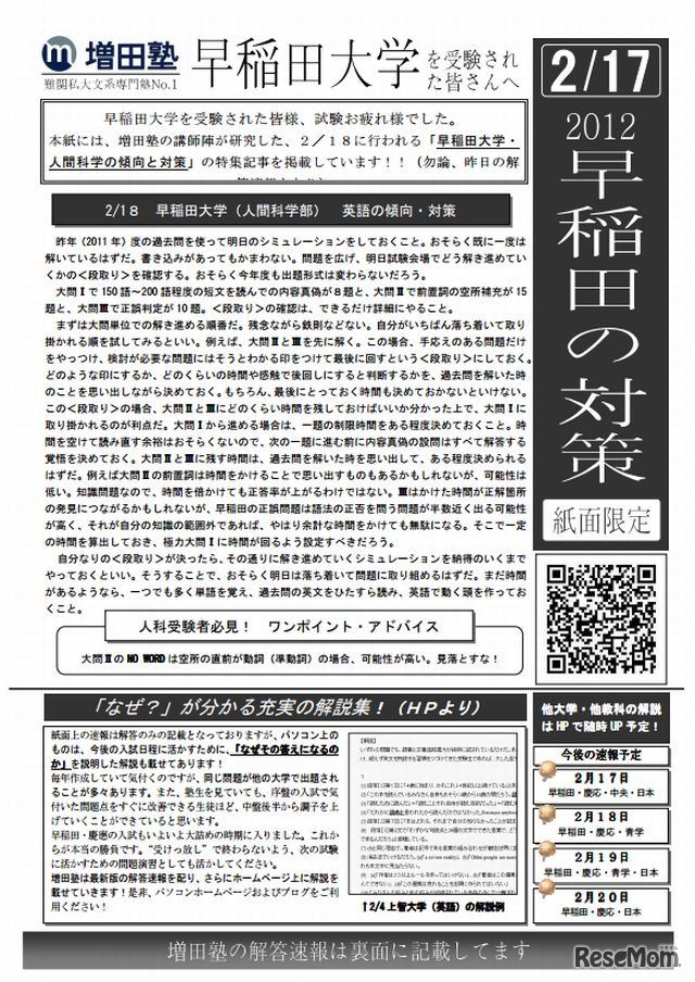 増田塾は、2月1日より大学受験生向けに難関私立大学入試の解答速報を大学前で配布するほか、同塾のホームページに掲載する。また、解答の根拠となる解説授業を映像で無料配信する。