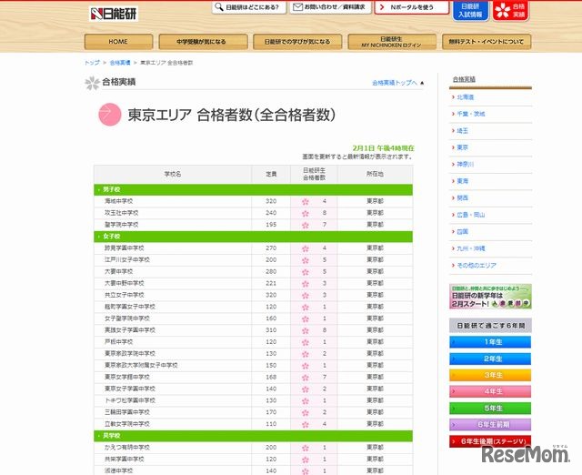 日能研は2月1日、東京と神奈川の中学受験合格者数を発表した。2月1日16時現在、東京エリアは渋谷教育学園渋谷や立教女学院など28校、神奈川エリアは桐蔭学園や洗足学園など19校の合格者数を発表した。