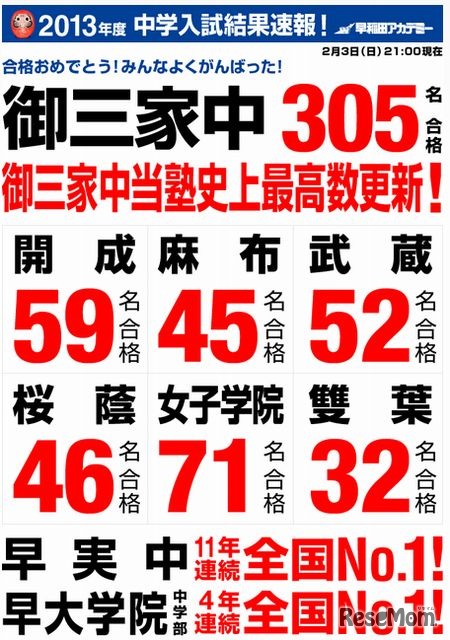 早稲田アカデミーは2月3日21時、すでに合格発表が行われた開成中学校、桜蔭など首都圏難関校の合格者速報をホームページに掲載した。
