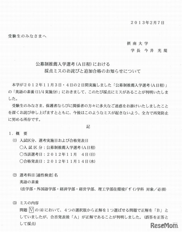 摂南大学は2月7日、2012年11月3日・4日に行われた推薦入試において採点にミスがあったことを公表し、7名を追加合格とすることを発表した。