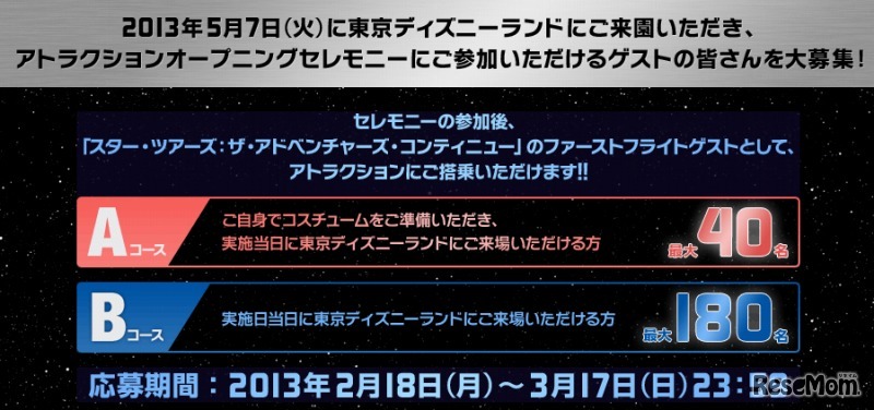 4月15日に開園30周年を迎える東京ディズニーリゾート。東京ディズニーランド(TDL)は、5月7日にグランドオープンする新アトラクション、「スター・ツアーズ:ザ・アドベンチャーズ・コンティニュー」のオープニングイベントに参加するゲストを200名募集する。