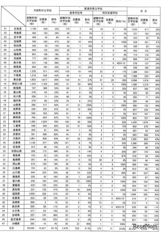 文部科学省が2012年度に実施した「学校施設の防災機能に関する実態調査調査」によると、防災機能の設置状況は、東京都や神奈川県、静岡県で高い傾向にあることがわかった。