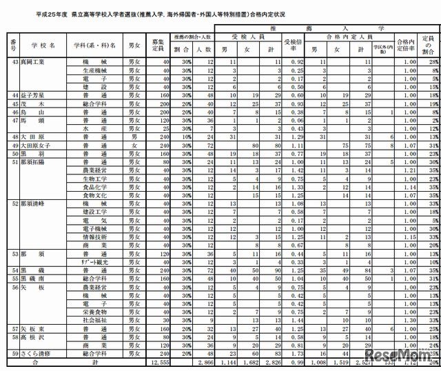 栃木県教育委員会は2月18日、県立高校入学者選抜(全日制課程学力検査)の出願状況を発表した。定員9,796人に対し、出願者12,131人で、出願倍率は1.24倍。また、推薦入学は定員2,866人に対し、受検者数2,826で、受検倍率は0.99倍となった。