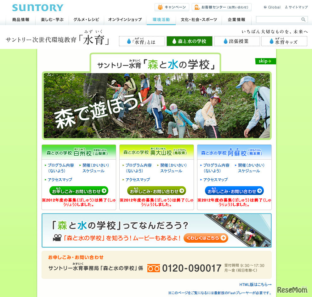 サントリーは、水の大切さを子どもたちに伝える次世代環境教育「水育(みずいく)」を広く展開している。同プログラムは、自然体験教室「森と水の学校」と小学校で行う「出張授業」のふたつを中心として活動を行っている。