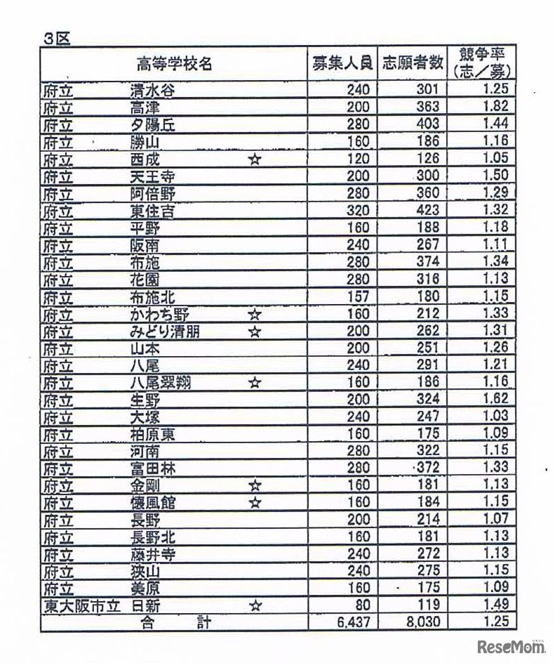 大阪府教育委員会は3月5日、公立高校の後期入学者選抜について、願書締め切り時点での志願状況を発表した。志願倍率は、全日制普通科が1.25倍、全日制総合学科が1.23倍、多部制単位制I部およびII部が1.17倍となった。