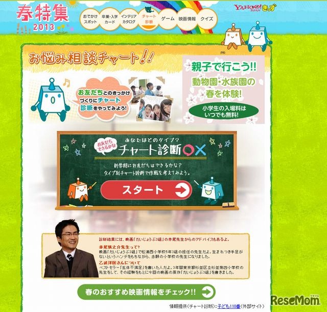 ヤフーが提供する子ども向けポータルサイト「Yahoo!きっず」は3月7日、「Yahoo!きっず春特集2013」を公開した。全国のおでかけスポット情報や新学期に役立つコンテンツを満載している。5月13日まで掲載予定。