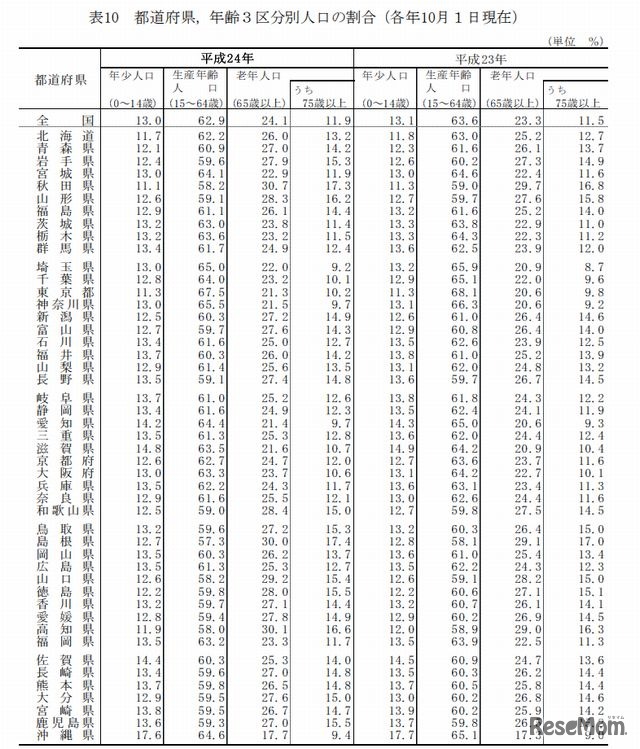 総務省が発表した2012年10月1日現在の人口推計によると、すべての都道府県で老年人口(65歳以上)が年少人口(14歳以下)を上回り、少子高齢化が加速していることが明らかになった。