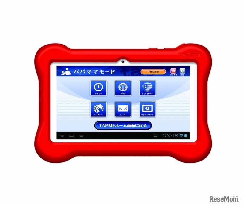 バンダイナムコグループのメガハウスは、7インチ液晶搭載の子ども向けタブレット端末「tap me(タップミー)」を7月中旬より発売すると発表。「セキュリティをしっかり」「楽しく遊んで学べる」という2つのコンセプトをもと開発されたという。