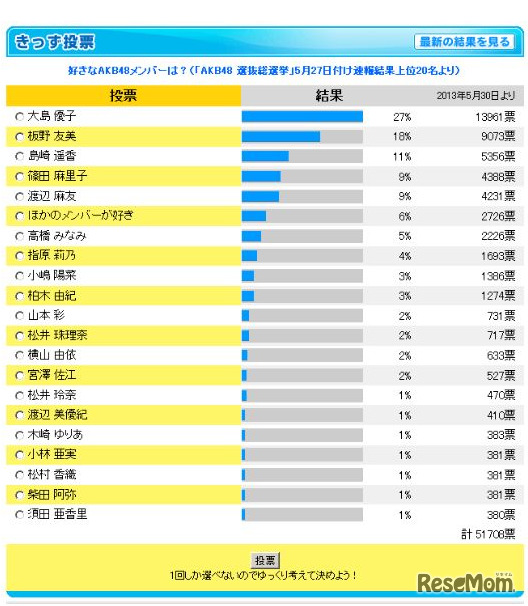 6月8日のAKB総選挙に先駆けて、「Yahoo!きっず」が子どもたちに好きなAKBメンバーをたずねる「きっず投票」を実施した。5月22日に公開された速報では、指原莉乃がダントツの1位だったが、きっず投票で子どもたちが選んだ1位は大島優子、2位は板野友美だった。