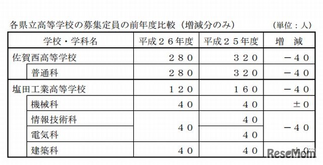 佐賀県教育委員会は7月25日、2014年度県立高校の生徒募集定員について発表した。2014年3月の県内の中学校卒業見込み者は、2013年3月と比較して106人減少するため、2014年度の県立高校全体の募集定員は前年比80人減の6,520人となる。