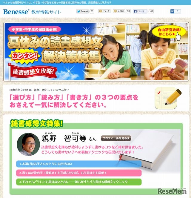 ベネッセ教育情報サイトでは、「夏休みの自由研究 解決策特集」と題して、子どもの学年や性格に即した自由研究の進め方を紹介。また、「読書感想文の解決策特集」も掲載している。夏休みの自由研究や読書感想文に悩んでいる小中学生の保護者は必見だ。