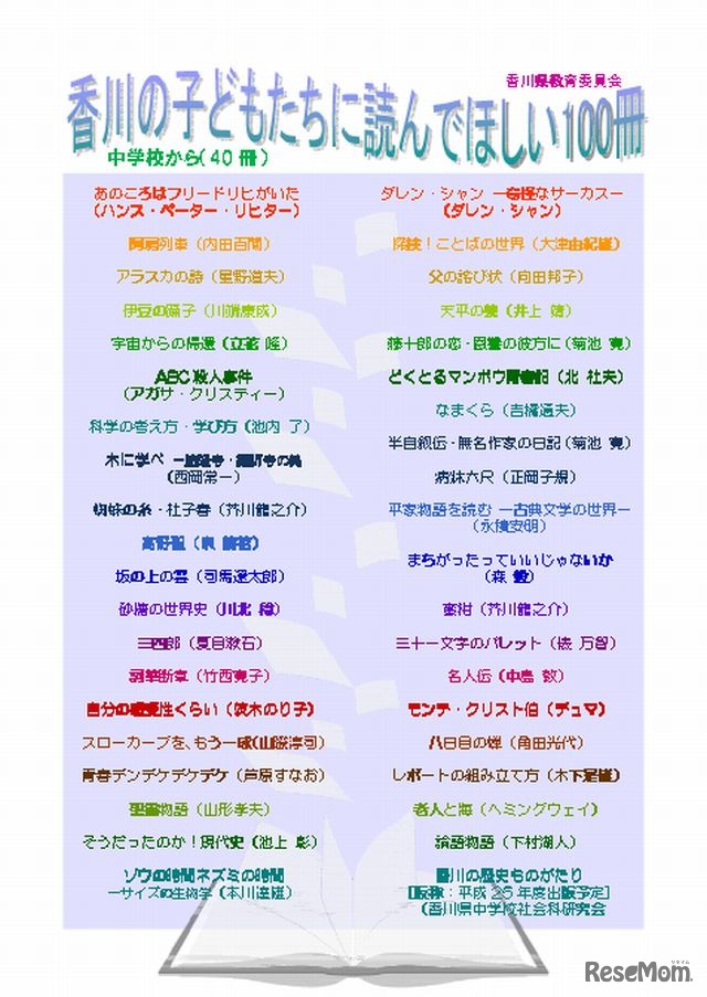 香川県は、子どもたちに本に親しんでもらおうと、「香川の子どもたちに読んでほしい100冊」を選定した。学年別におすすめの本を選び、県立図書館で特別コーナーを設置するなどして、小中学生に紹介している。