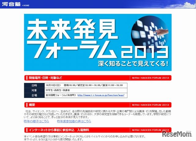 河合塾は、10月13日(日)に中高生とその保護者を対象とした「未来発見フォーラム2013」を東京国際フォーラムで開催する。先端技術に携わる大学・企業の専門家が、その魅力を語る。入場無料で事前申し込みが必要。