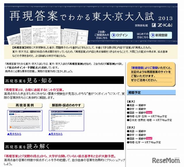 Z会は8月5日、2013年度の東京大学・京都大学入試の詳細分析を公開する「再現答案でわかる東大・京大入試2013」特設サイトにて、東大国語と京大文系国語の情報を公開した。実際に東京大学・京都大学を受験したZ会員が再現した答案を元にしている。