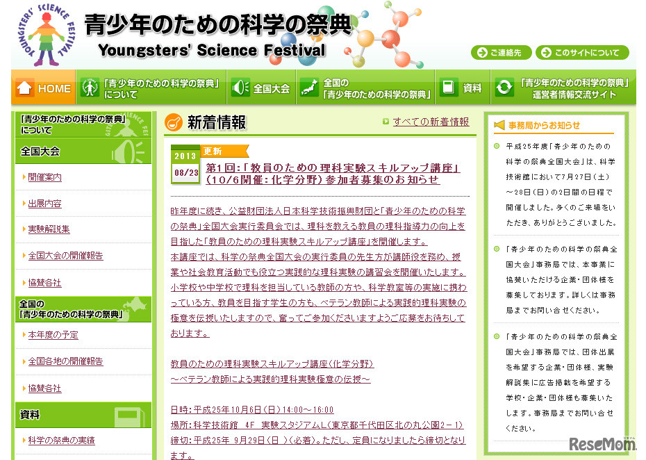日本科学技術振興財団と「青少年のための科学の祭典」全国大会実行委員会は、小中学校の理科担当教員の指導力向上を目的とした「第1回 教員のための理科実験スキルアップ講座」を10月6日、科学技術館で開催する。