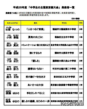 東京都は9月8日、社会に向けた中学生の思いや考えを広く都民に理解してもらうことを目的に、「平成25年度中学生の主張 東京都大会」を都民ホールにて開催する。