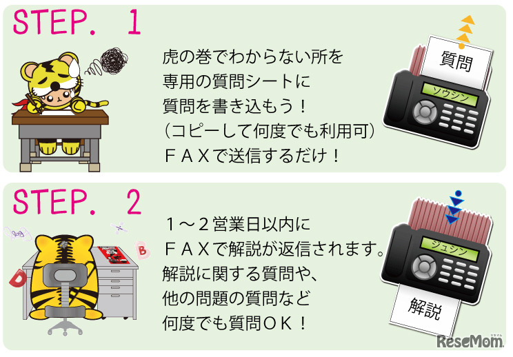 分野別過去問題集「高校入試 虎の巻」を出版するガクジュツは、2014年度版より無料質問受付サービス「とらサポ」を開始する。何度でもFAXなどで質問ができる。