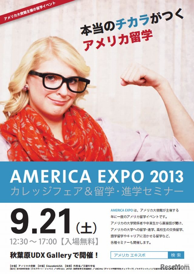 アメリカ大使館は、9月21日(土)にアメリカ留学イベント「AMERICA EXPO 2013」を秋葉原UDX Galleryで開催する。参加無料で入退場自由。事前登録すると来場時にアメリカ大使館特製グッズがもらえる。