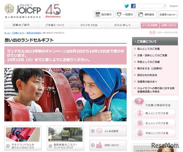 国際協力NGO団体ジョイセフ(JOICFP)が10月15日(火)まで、アフガニスタンの子どもたちにランドセルを寄贈する「想い出のランドセルギフト」を行っている。使われなくなったランドセルを寄贈することで、子どもたちの就学に役立てることを目的とした活動。