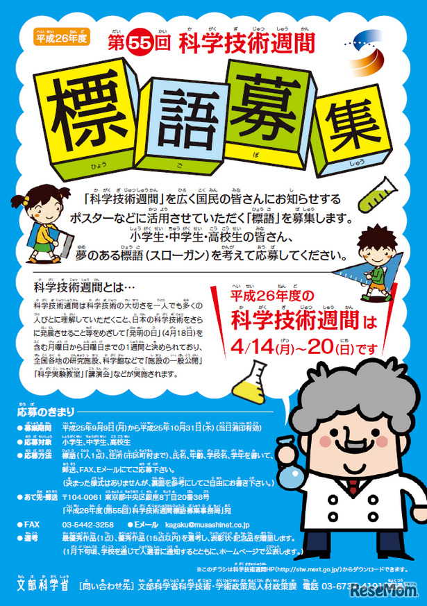 文部科学省は、小学生から高校生を対象に、科学技術の振興を図るため毎年4月に行われる「科学技術週間」の平成26年度(第55回)の標語を募集する。