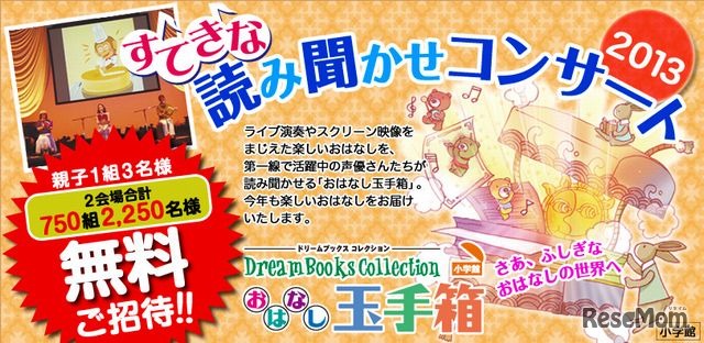 小学館は「すてきな読み聞かせコンサート2013 おはなし玉手箱」を、10月6日に名古屋で、10月27日に東京で開催する。2会場あわせて、親子750組2,250名を無料招待するという。