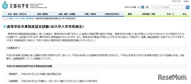 文部科学省は、平成25年度第2回高等学校卒業程度認定試験(旧大検)の願書を9月17日(消印有効)まで受け付けている。試験日は、11月9日と10日。