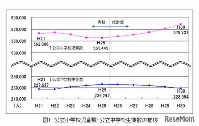東京都教育庁は9月12日、2014年度から2018年度における都内公立小中学校の児童・生徒数の推計速報値を発表した。2013年度に比べ、2018年度は公立小学校児童数が4.1%増えて578,321人、公立中学校生徒数は3.1%減って228,954人になると見込まれている。
