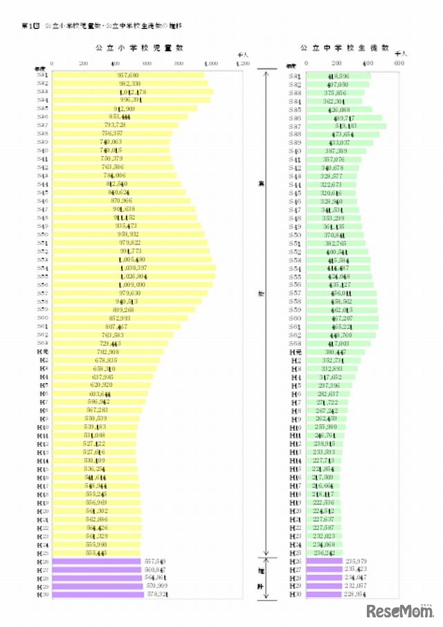 東京都教育庁は9月12日、2014年度から2018年度における都内公立小中学校の児童・生徒数の推計速報値を発表した。2013年度に比べ、2018年度は公立小学校児童数が4.1%増えて578,321人、公立中学校生徒数は3.1%減って228,954人になると見込まれている。