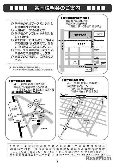 東京都教育委員会は、都立高等学校・中等教育学校および中学校などの受験生や保護者を対象とした「都立高等学校等合同説明会」を10月27日より晴海・新宿・立川の都立高校で開催する。